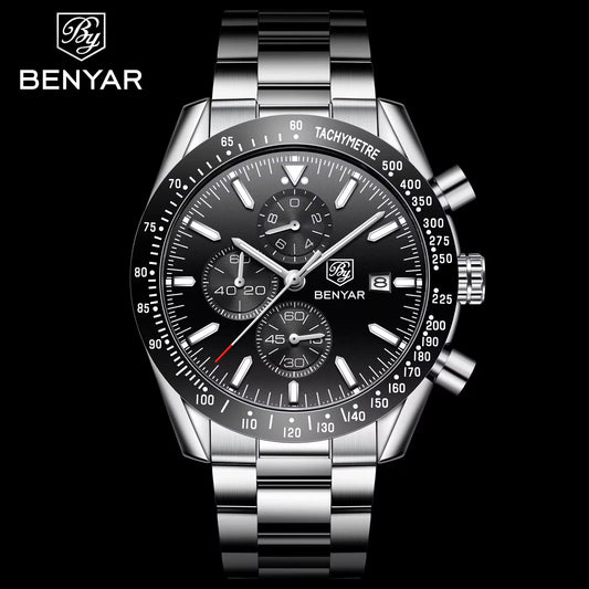 BENYAR Men Watch Top Brand Stainless Steel Band Luxury Business Sport Chronograph Quartz Wristwatch Men Clock