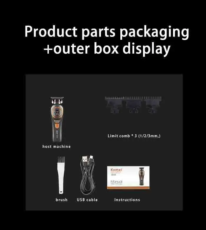 SPECIFICATIONSBattery: 1500mAhBlade Material: Carbon SteelBrand Name: KemeiCertification: CECharging Time: 3HChoice: yesFunction: wet haircut,dry haircut,Automatic cleaning,Washing knives under water,Fast Charging,Charging indicationHign-concerned Chemical: NoneIs Batteries Included: YesKemei Model: KM-999Length adjustment method: Change of nozzlesMinimum haircut length: 0.5 - 1 mmMotor: ROTARYMotor type: ROTARYOrigin: Mainland ChinaPower: 5WPower Source: RechargeablePower Type: RechargeableStatement: No oil...
