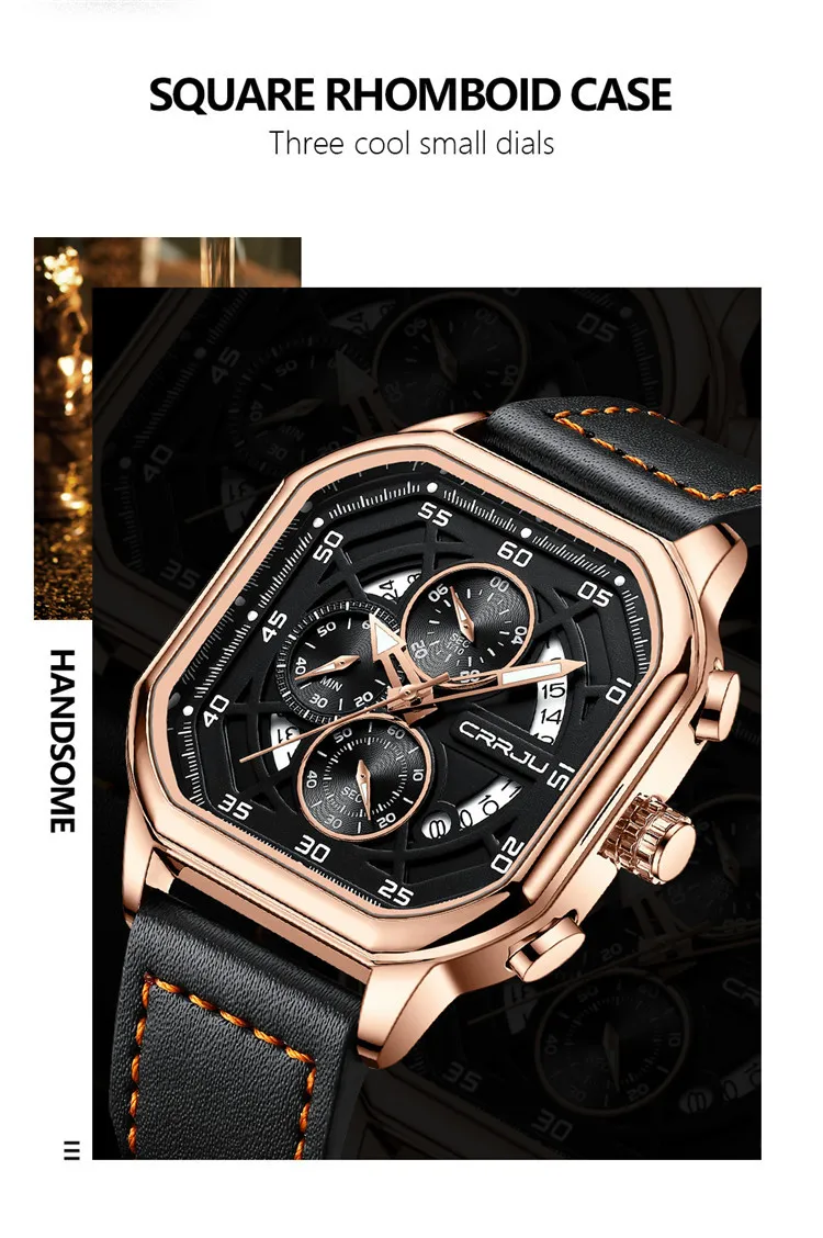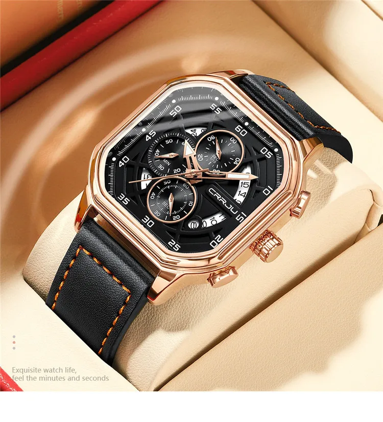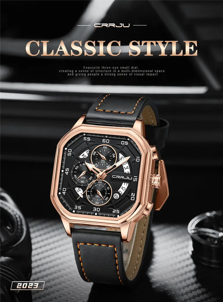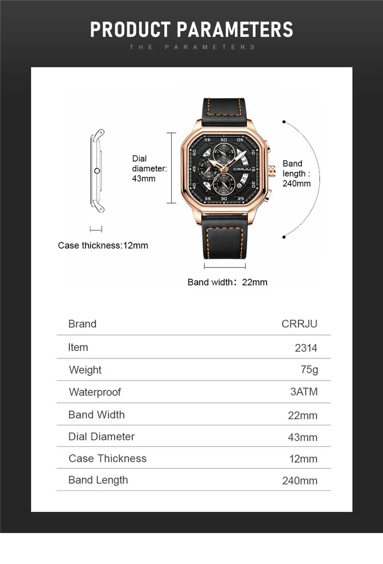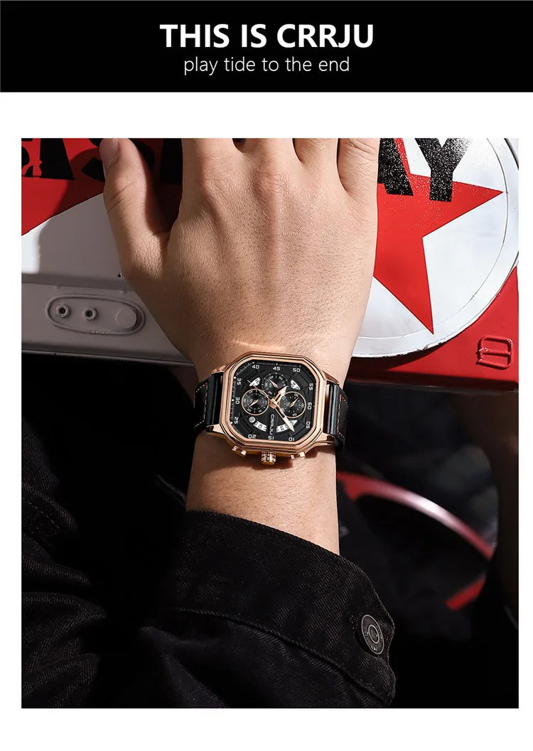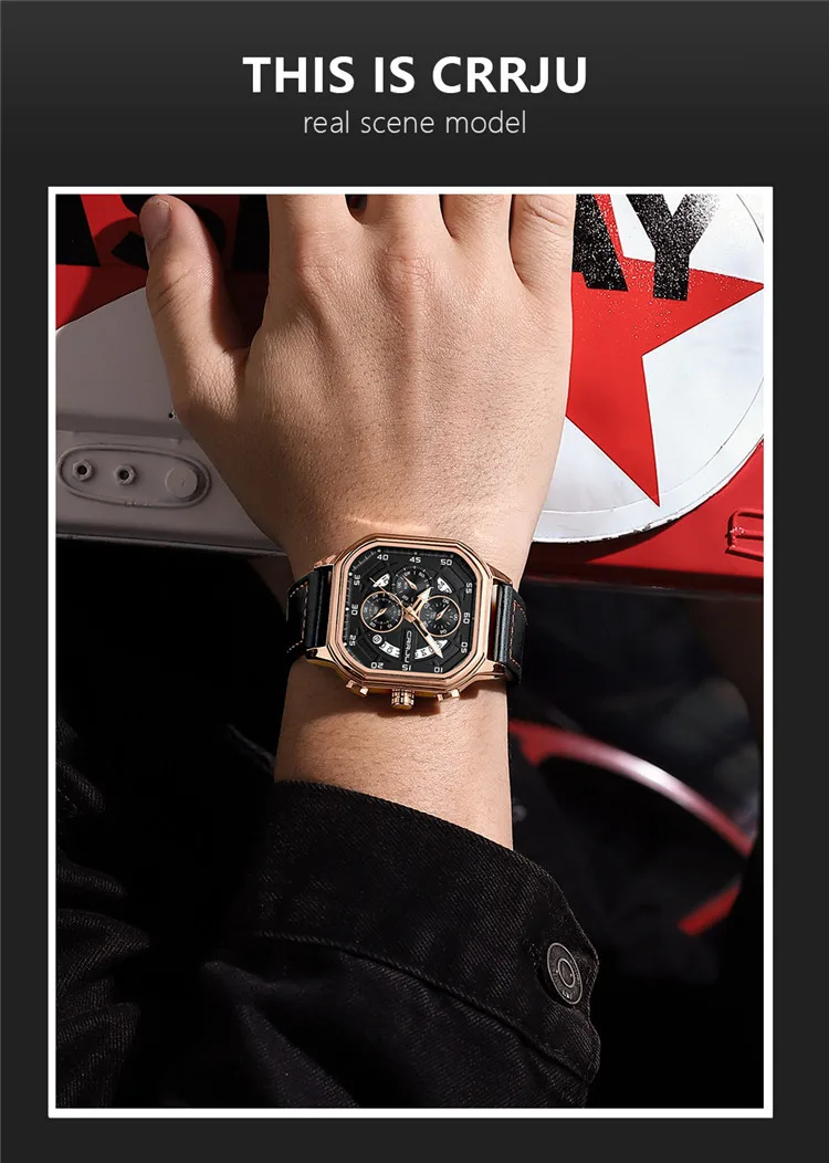 SPECIFICATIONSAge: 2023Band Length: 24cmBand Material Type: LeatherBand Width: 22 mmBand material: Top Leather strapBattery Life: 2 yearsBrand Name: CRRJU,CRRJU WatchCase Material: Stainless SteelCase Shape: OvalCase Thickness: 12 mmClasp Type: Folding Clasp with SafetyColor: 4-colorsDial Diameter: 43mmDial Display: PointerDial Window Material Type: HardlexFeature: chronograph,Day/Date,Waterproof,Luminous,Luminous HandsKeywords: Luxury Quartz WristwatchesLogo: CRRJU-logoMOQ: 1-pcsMaterial: LeatherModel...