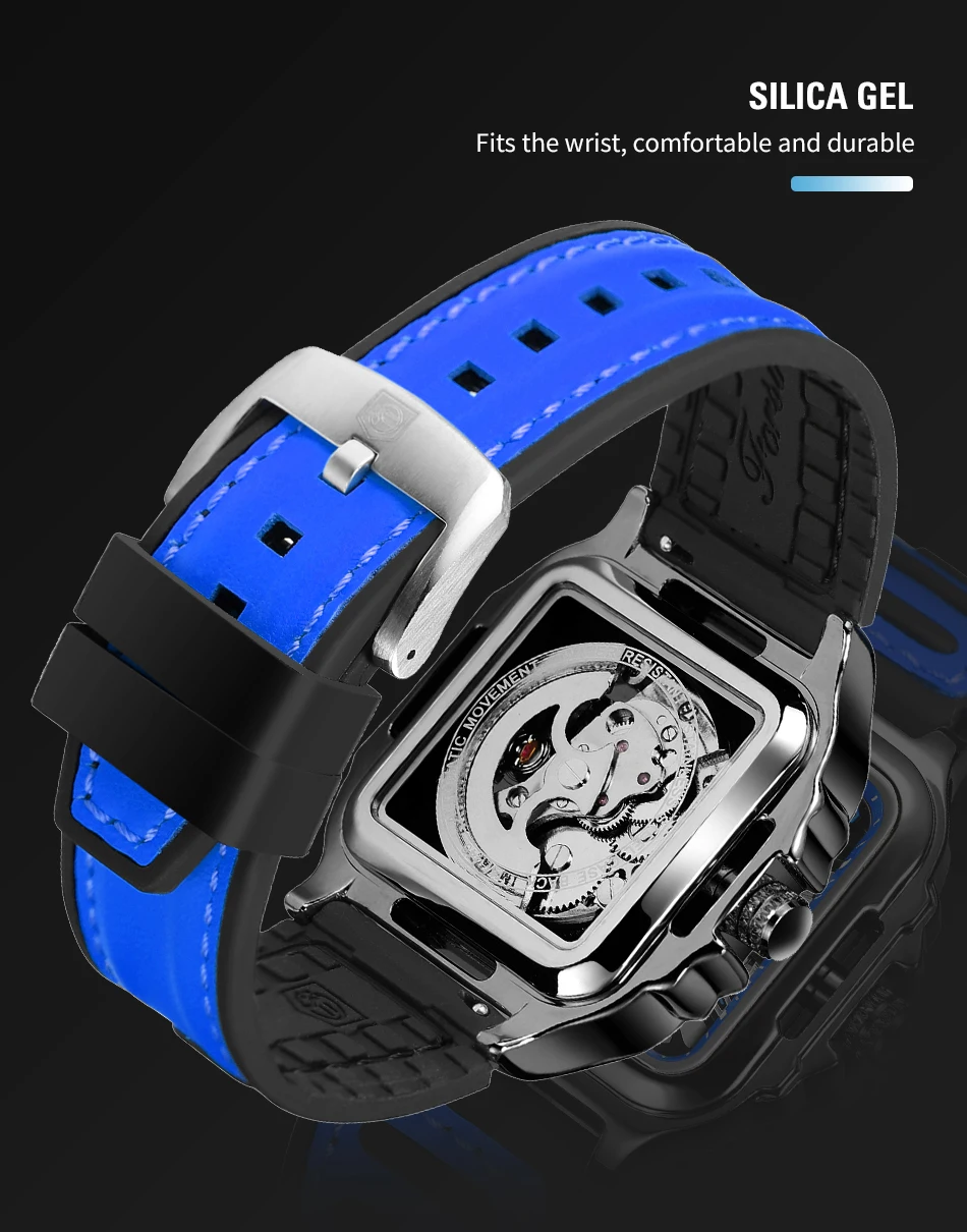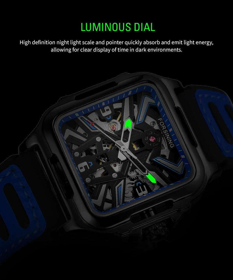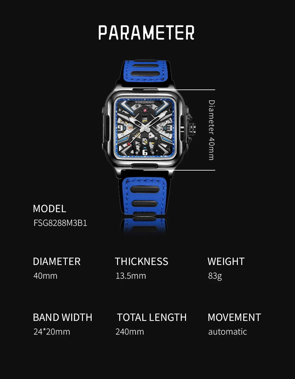 SPECIFICATIONSAge: NewBand Length: 20 cmBand Material Type: Silica gelBand Width: 22 mmBrand Name: ForsiningCase Material: AlloyCase Shape: SquareCase Thickness: 13.5mmClasp Type: BuckleDial Diameter: 40 mmDial Display: PointerDial Window Material Type: HardlexFeature: LuminousMaterial: AlloyModel Number: FSG8288M3Movement: Mechanical(Auto)Movement Brand: SHANGHAIPlace of Origin: Guangdong, ChinaStyle: sport,Fashion,Hip Hop,StreetType: CHARM,Fashion,Luxury,AutomaticUser: MenWater Resistance Depth: No waterproofWeight:...
