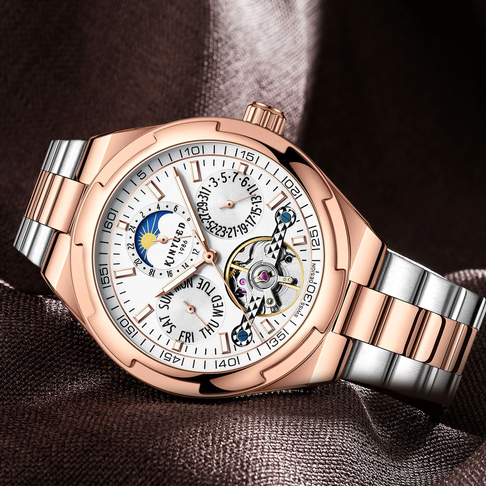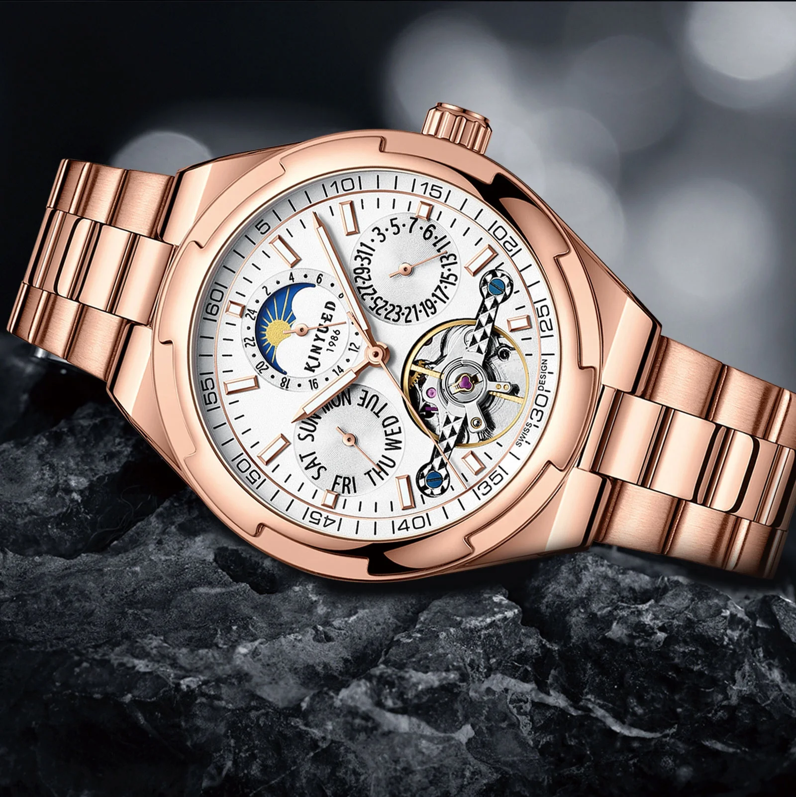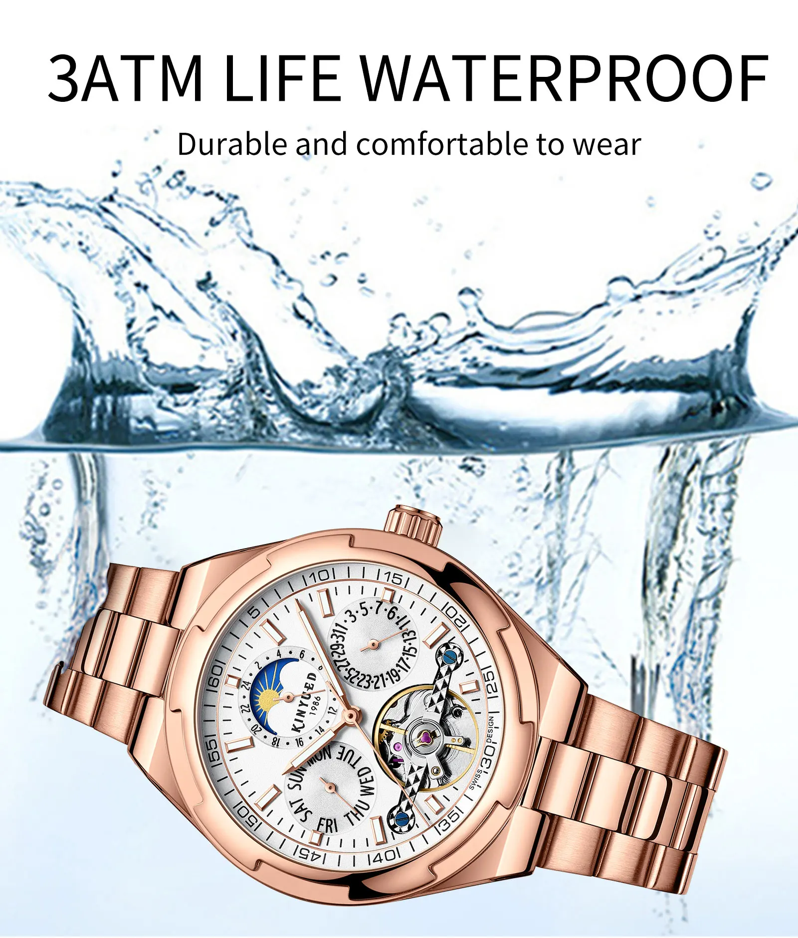 Feature: Luminous,Waterproof,hollow out,Moon Phase,tourbillon,Power Reserve,Water Resistant,Luminous Hands,chronograph,Day/Date