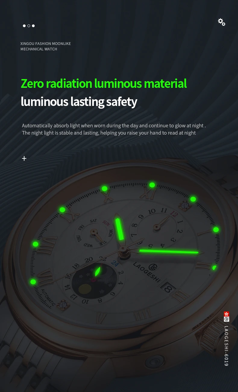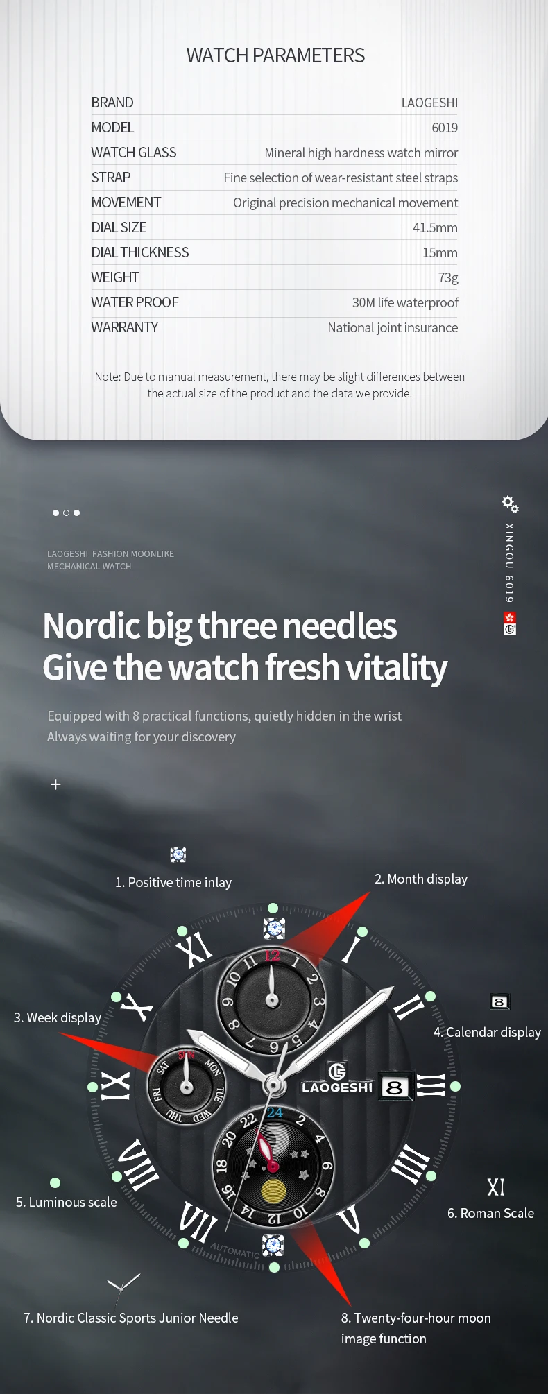 Feature: Auto Date,Complete Calendar,Day/Date,Moon Phase,Power Reserve,Water Resistant,Waterproof,Luminous,Week Display,Luminous Hands,Small three needle