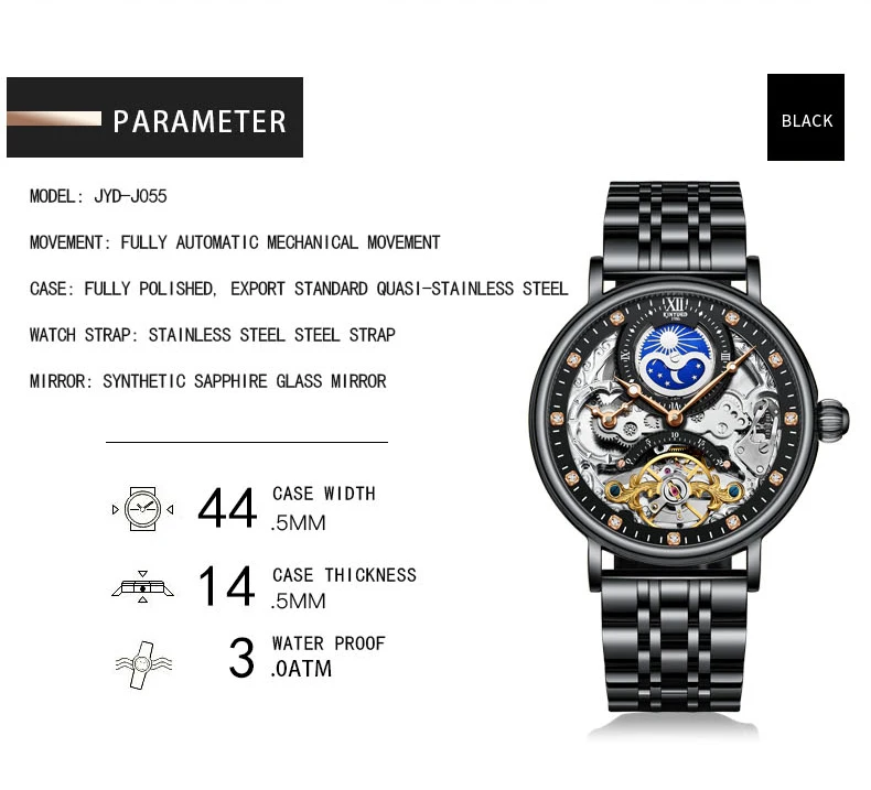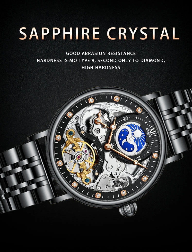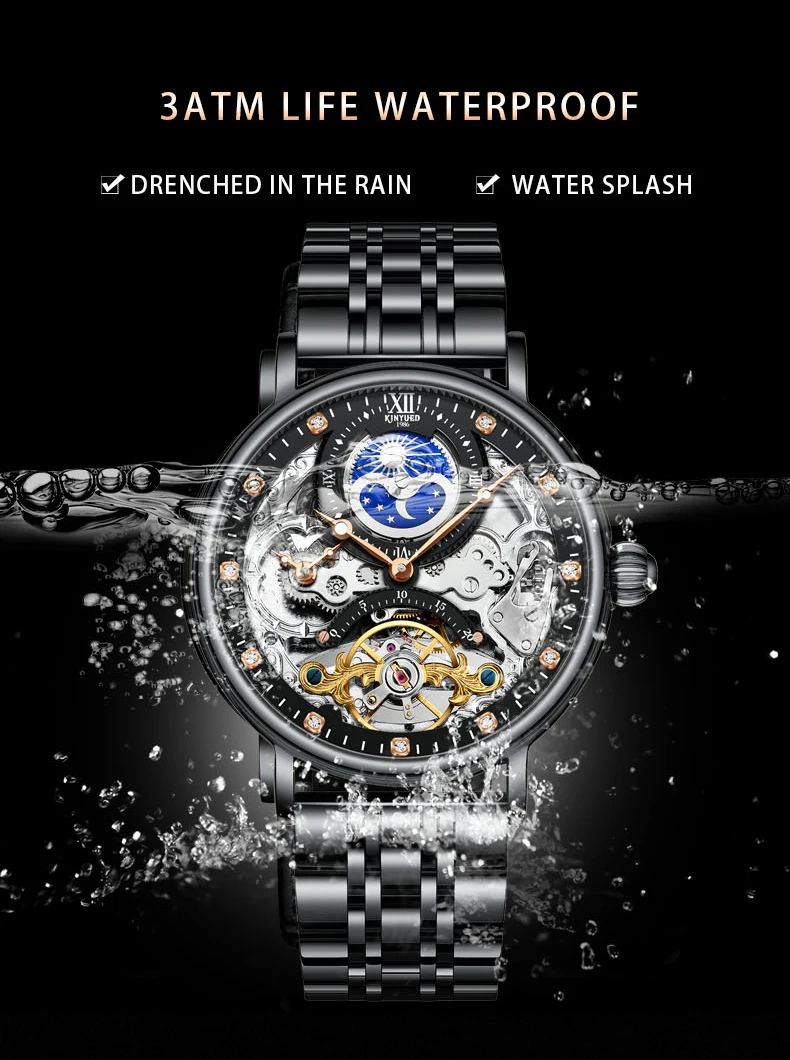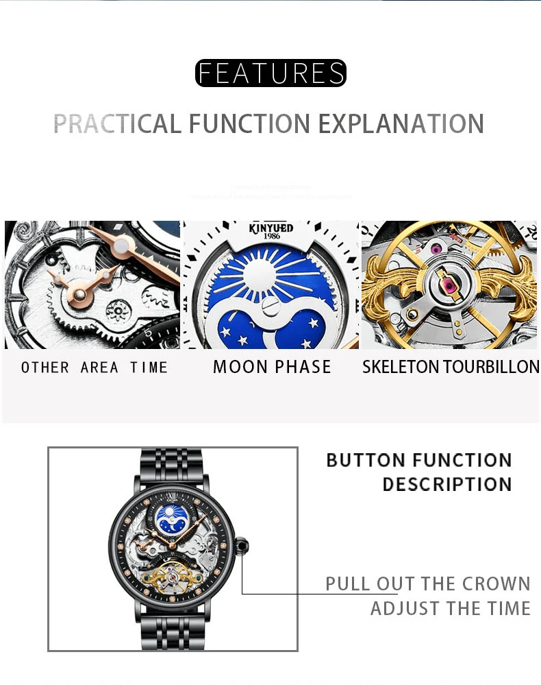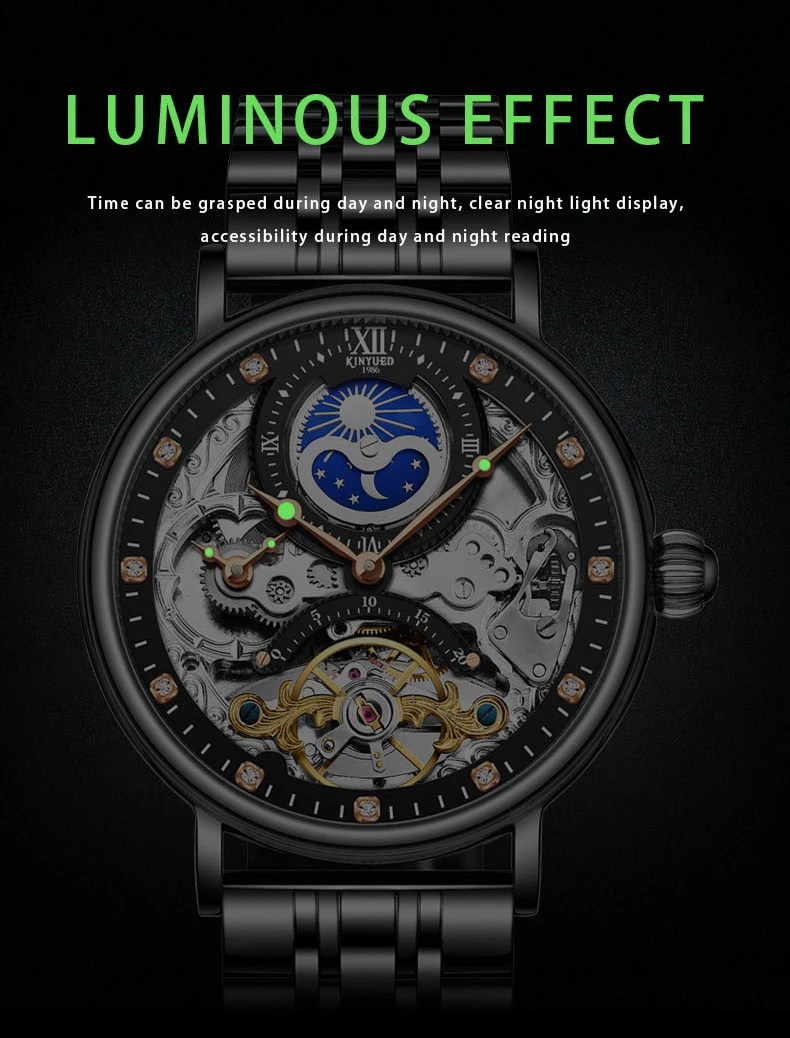 Feature: Alarm,Auto Date,Day/Date,Moon Phase,Perpetual Calendar,Power Reserve,Water Resistant,Waterproof,Luminous,Luminous Hands,hollow out,tourbillon