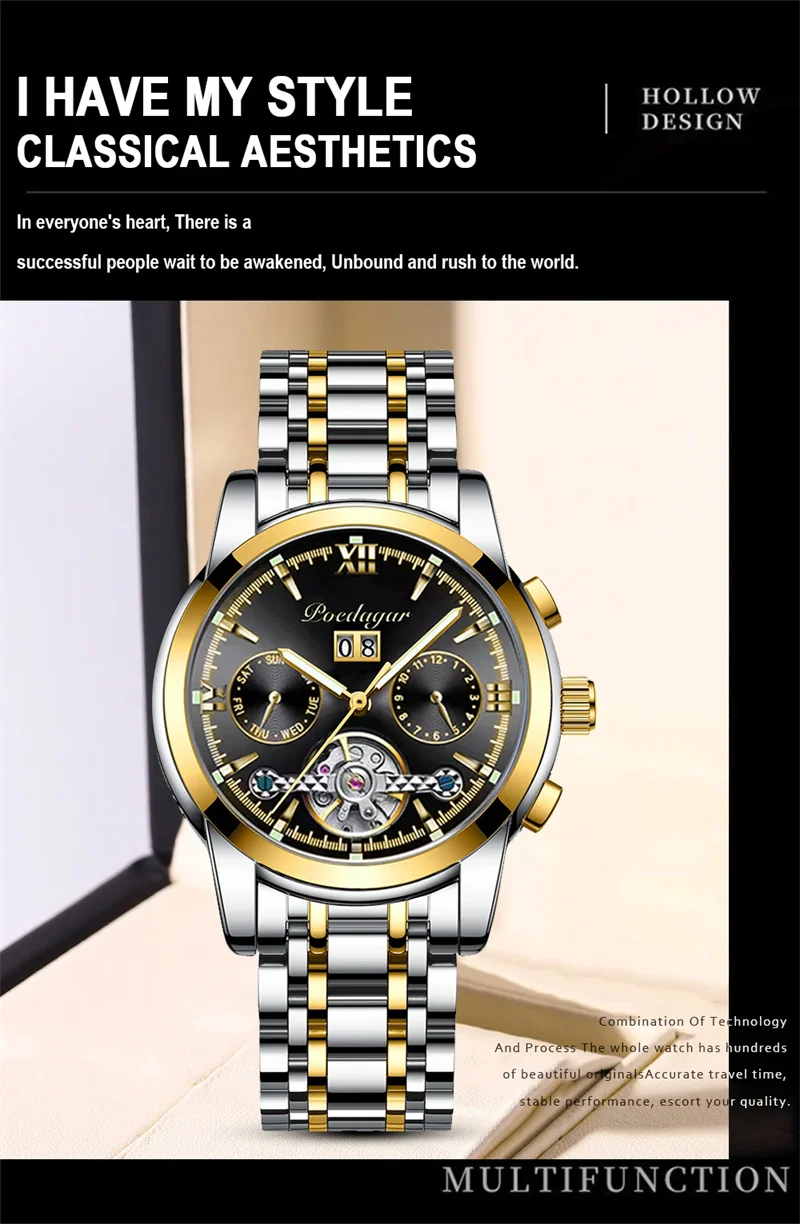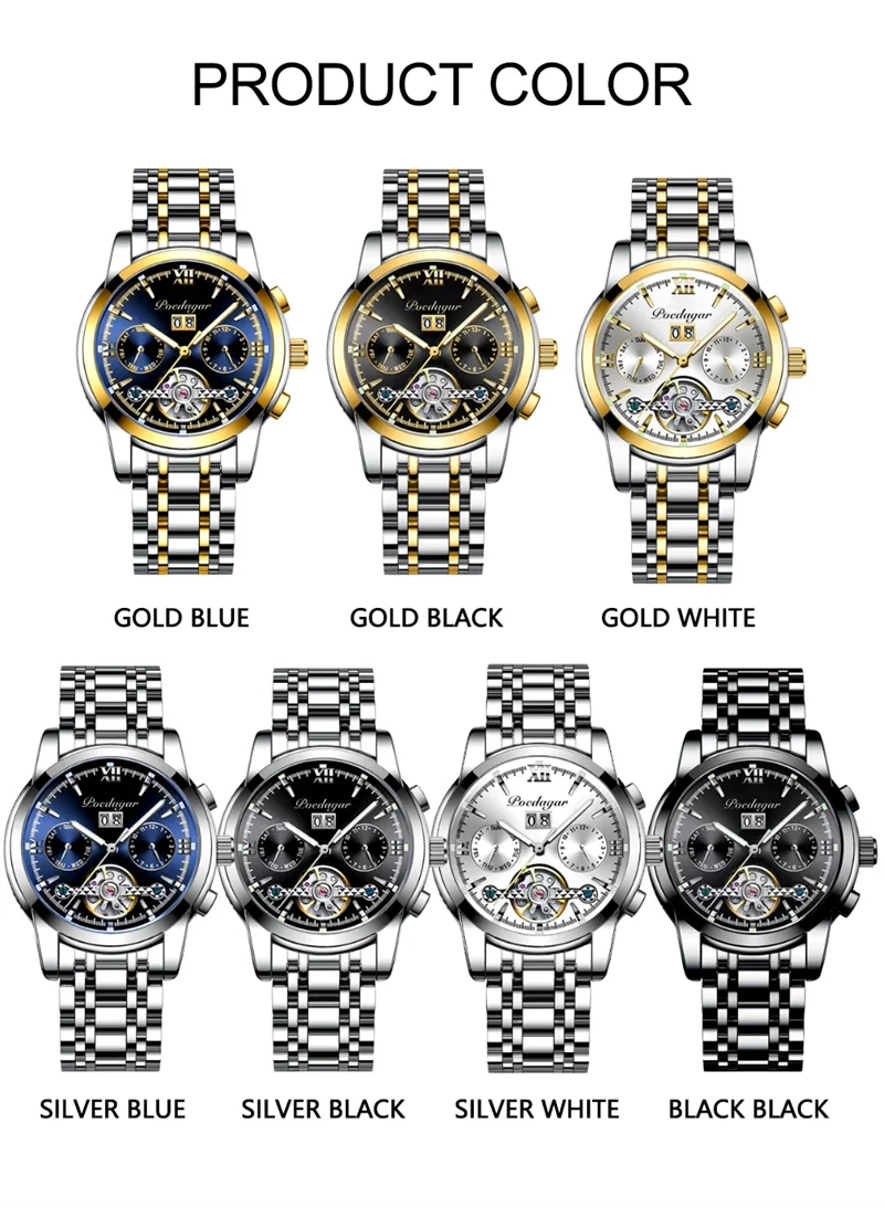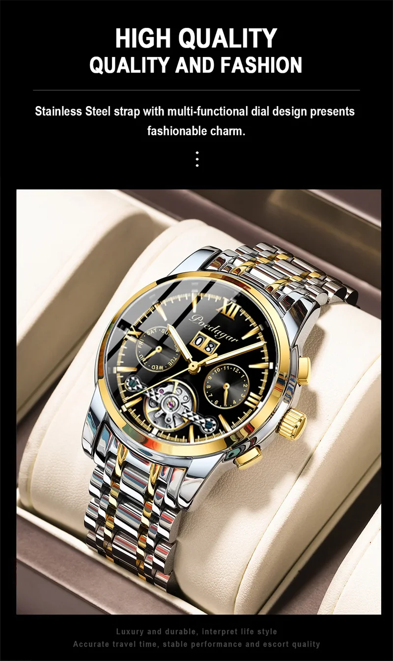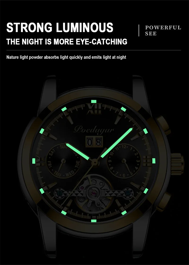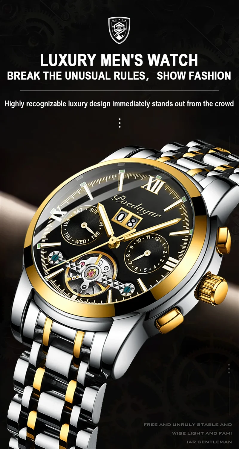 POEDAGAR Automatic Mechanical Man Wristwatch Hollow Tourbillon Stainless Steel Men Watch Waterproof Luminous Date Men's Watches