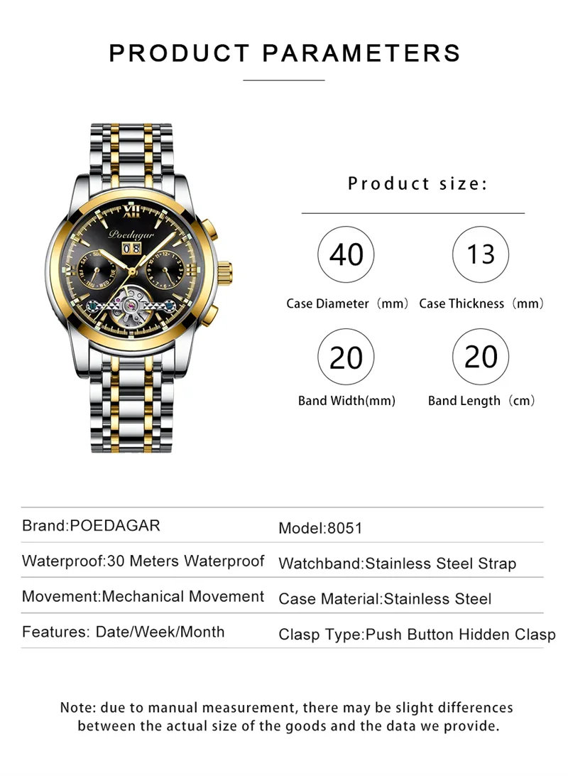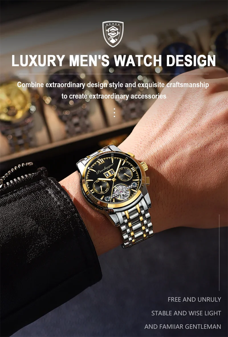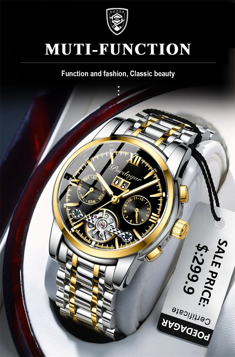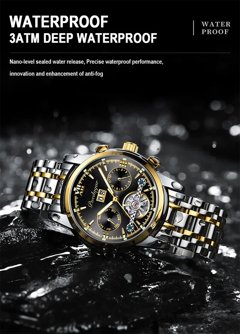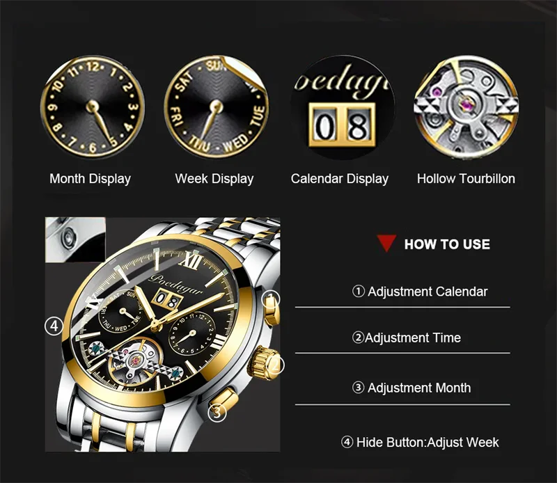 POEDAGAR Automatic Mechanical Man Wristwatch Hollow Tourbillon Stainless Steel Men Watch Waterproof Luminous Date Men's Watches