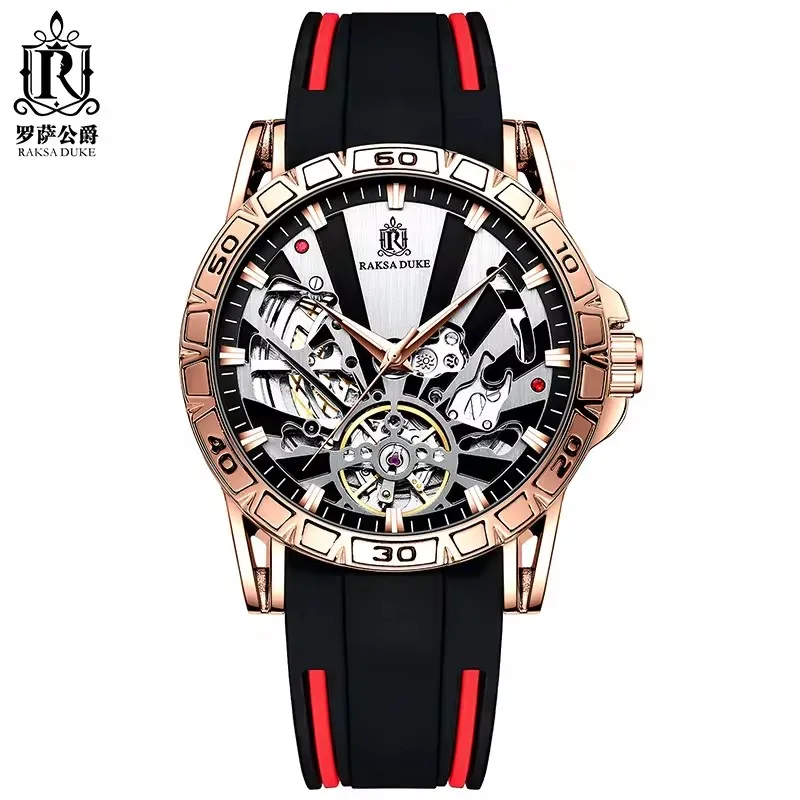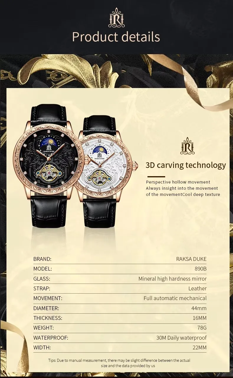Raksa Duke New Brand High Quality Automatic Genuine Leather Tourbillon Moon Phase Stereo Carving Men Watch
