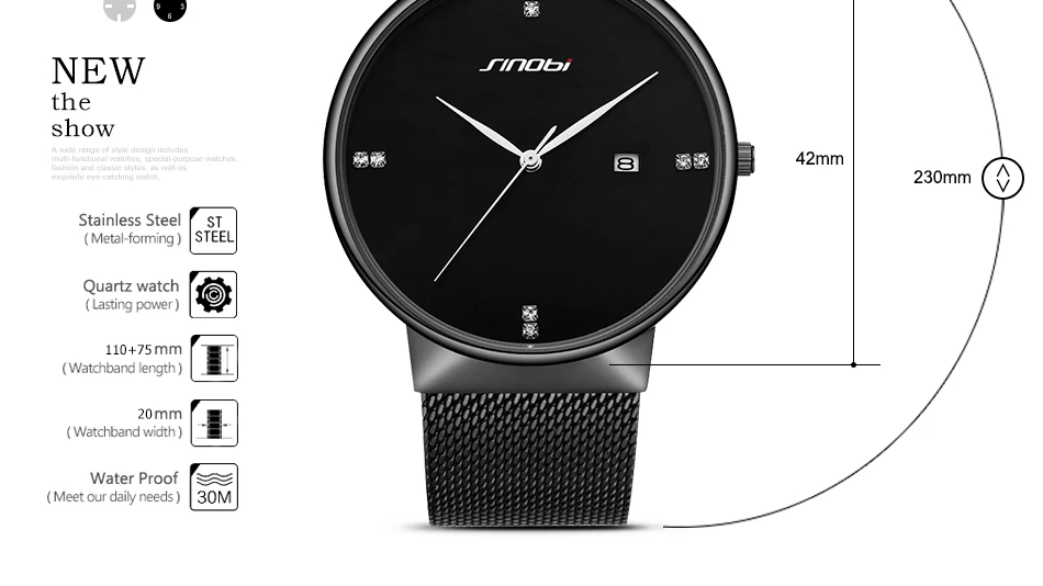 SPECIFICATIONSBand Length: 23cmBand Material Type: Stainless SteelBand Width: 22 mmBand material: Stainless Steel Band WatchBattery Life: 18 monthsBrand Name: sinobiCase Material: AlloyCase Shape: RoundCase Thickness: 7 mmClasp Type: BuckleColor: Customized ColorsDial Diameter: 42 MMDial Display: PointerDial Window Material Type: GlassFeature: Water Resistant,WaterproofGender: Men,boy,gentlemenKeywords: Wrist Watches menLogo: Accept CustomizedMaterial: AlloyModel Number:...