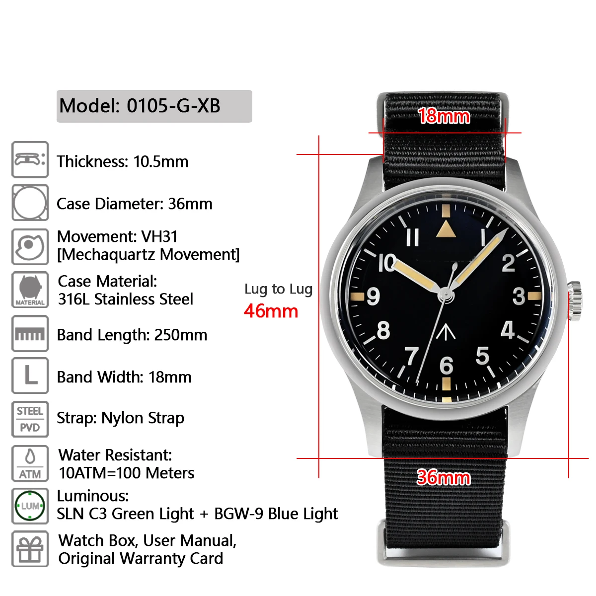 VH31 Men's 36mm Simple Style Watch Mechaquartz Movement Analog Display 10 Bar Luminous Nylon Strap 30mm Dial Diameter Diver