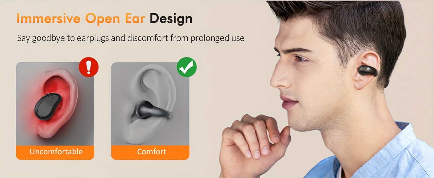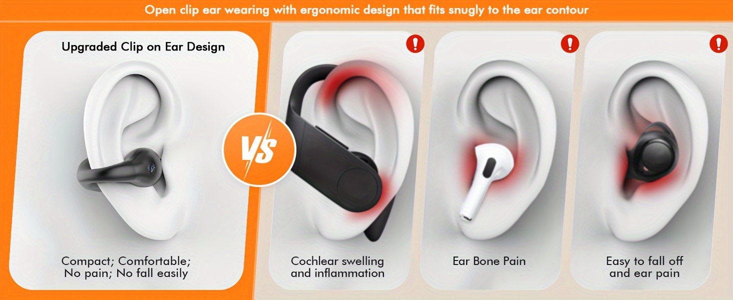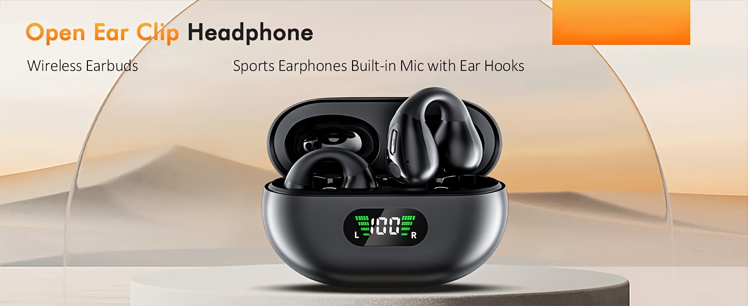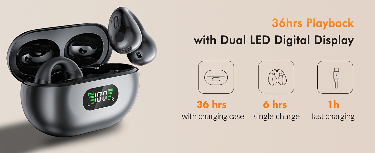 60 Hour Playback Time Bone Conduction Earphones - Advanced Wireless Clip-On Earbuds with Digital Display Charging Case - Perfect for Running, Walking, Exercise, and Active Lifestyles