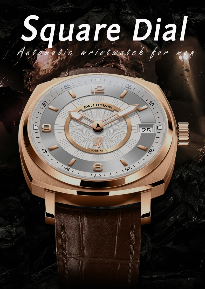 For Lobinni Luxury Stainless Steel Automatic Skeleton Watch for Men 16055 Fashion Men's Watch with Square Case and Leather Band