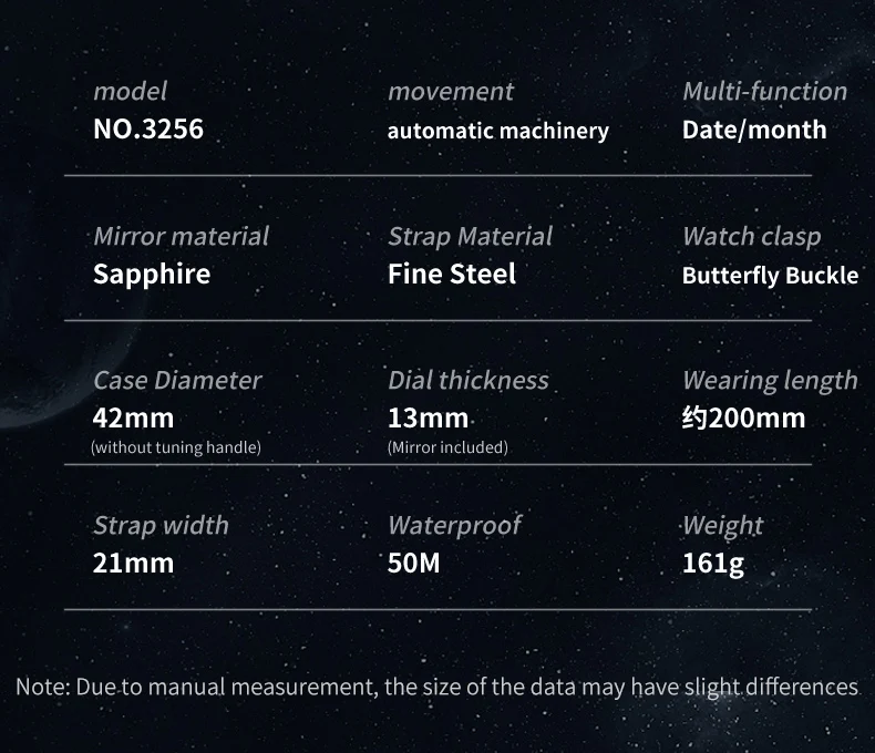 SPECIFICATIONSBand Length: 20.0cmBand Material Type: Stainless SteelBand Width: 20.0mmBrand Name: OUPINKECase Material: Stainless SteelCase Shape: RoundCase Thickness: 10.0mmClasp Type: Push Button Hidden ClaspDial Diameter: 42.0mmDial Display: AnalogDial Window Material Type: SAPPHIRE CRYSTALFeature: Auto Date,Complete Calendar,DIVER,Water Resistant,Luminous,Week Display,Luminous Hands,Shock ResistantMaterial: AlloyModel Number: 3256Movement Brand: Imported movementPlace of Origin: ChinaType: Fashion,Automatic,sportUser: MenWater...