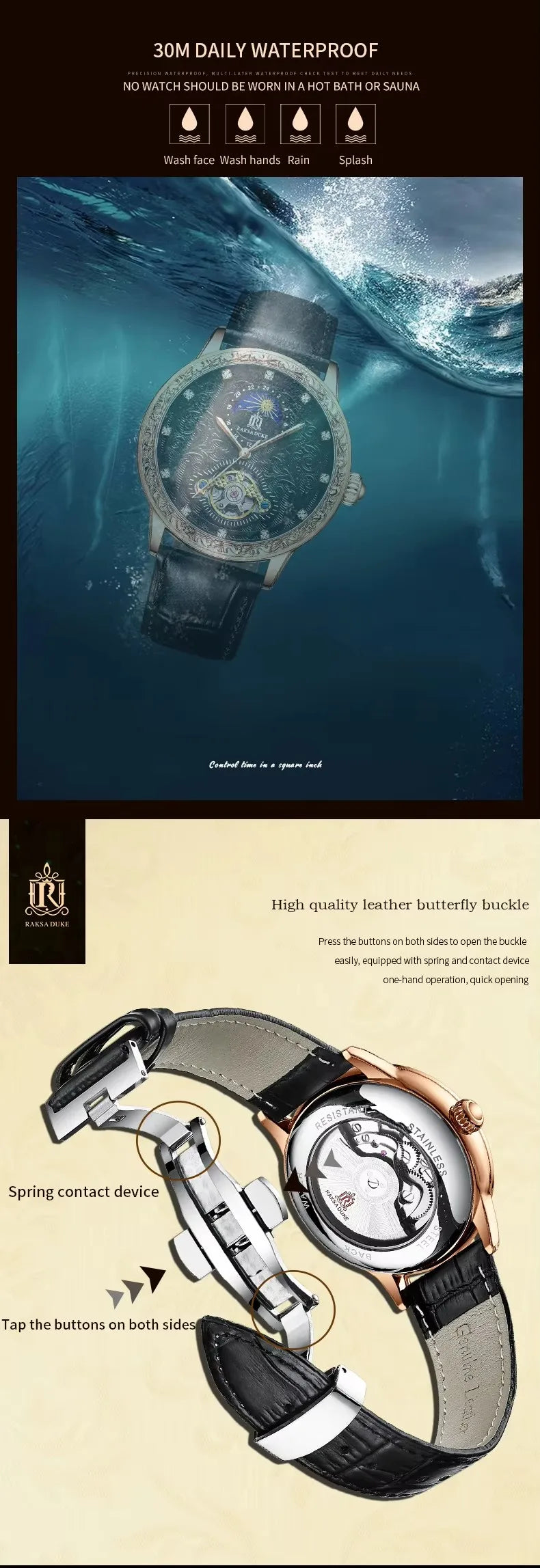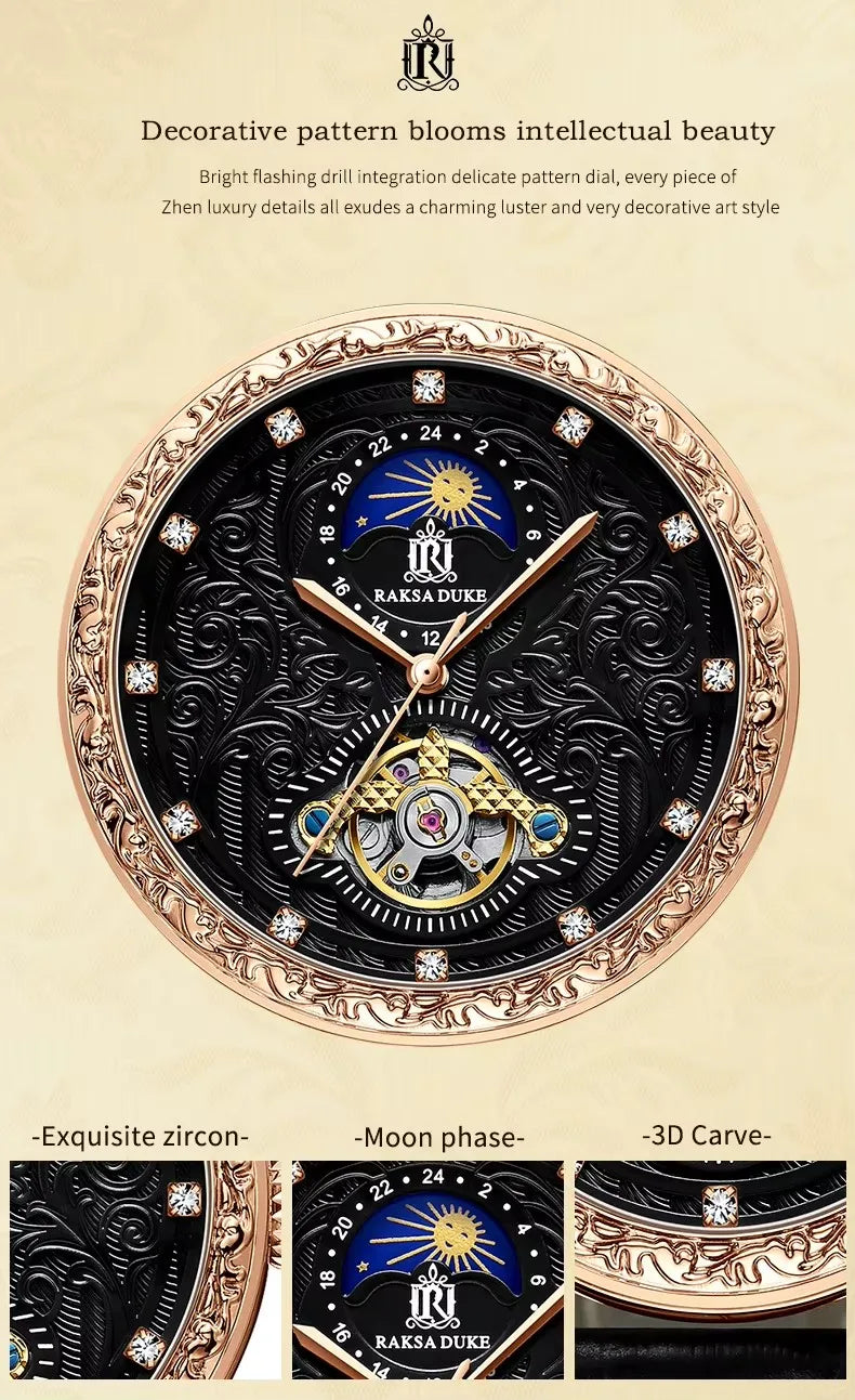 Raksa Duke New Brand High Quality Automatic Genuine Leather Tourbillon Moon Phase Stereo Carving Men Watch