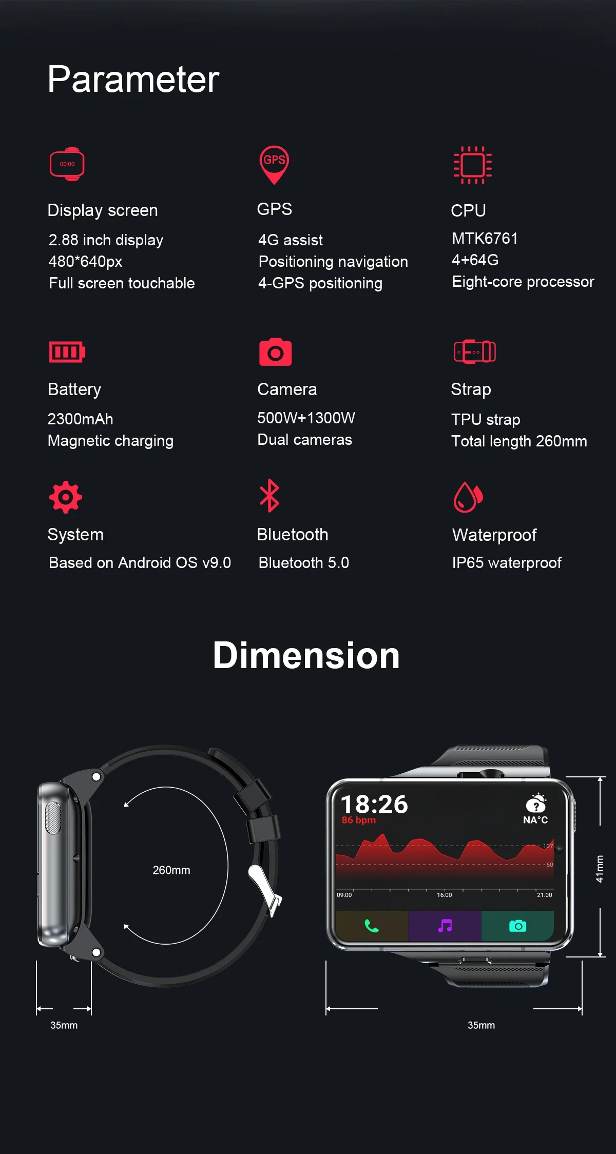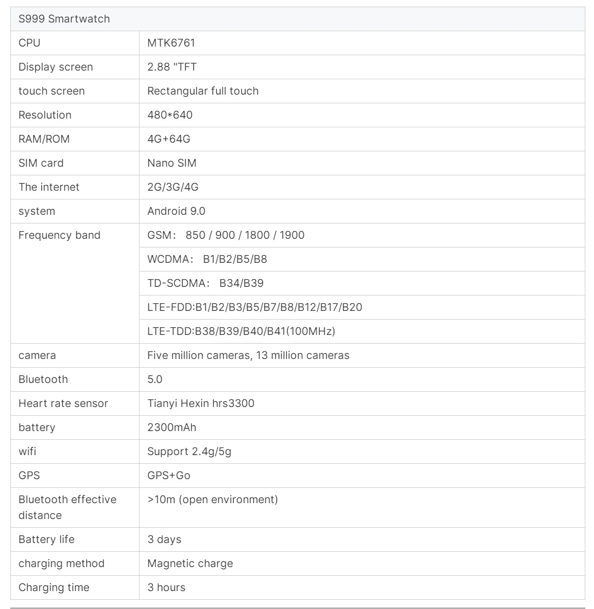 S999 Smart Watch Phone 4G LTE Android 9 4+64GB Smartwatch 2.88" Screen Men Watch 2300mAh Dual Camera Face Unlock GPS WIFI