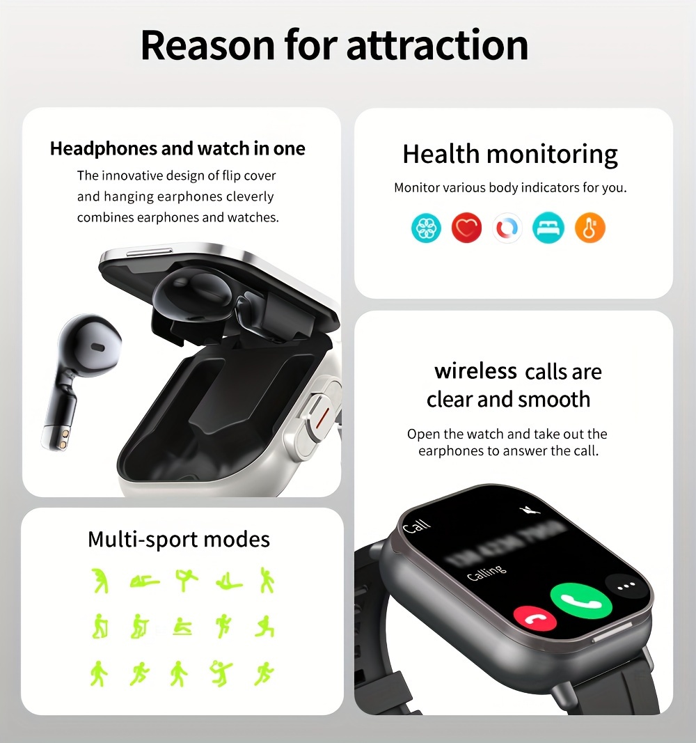 Two-in-One Wireless Earphone Watch - Smartwatch with Built-in Earphones, Multi-functional Sports Features, and Quick Call Answering - Convenient, Sweat-Resistant, and Stylish