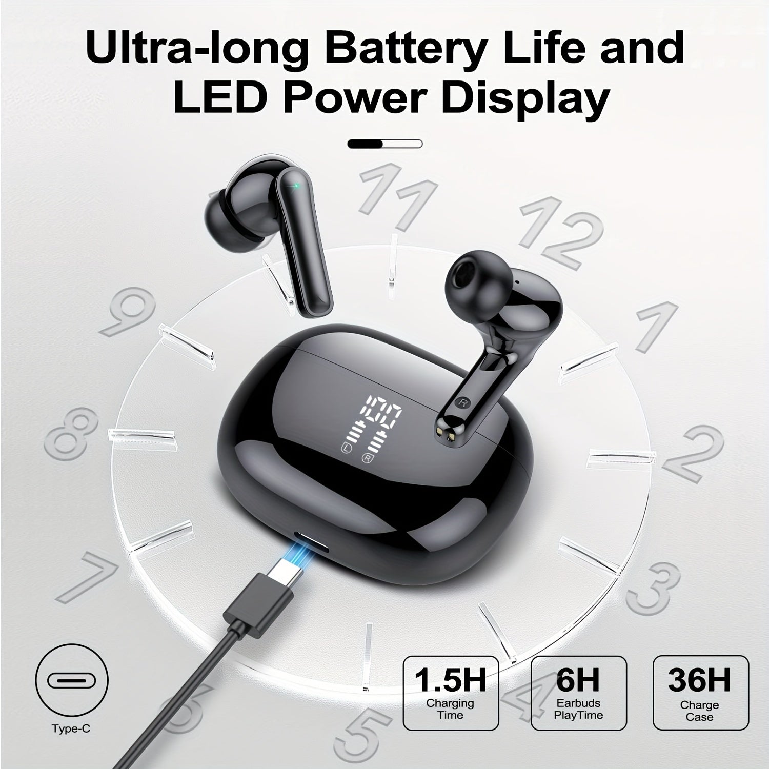 Wireless Earphones, Wireleess 5.3, 13mm Speaker, 30 Hours Of Playback Time, Suitable For IPhone And Android, For Gaming, Business, And Sports With Microphone. With Digital Display Battery Level